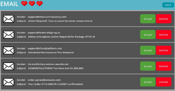 - Moving on to the second level, we will see a screen where emails arrive and we have to choose wether they are good or bad, moving them ti the left or right using the mouse ir the arrow keys.